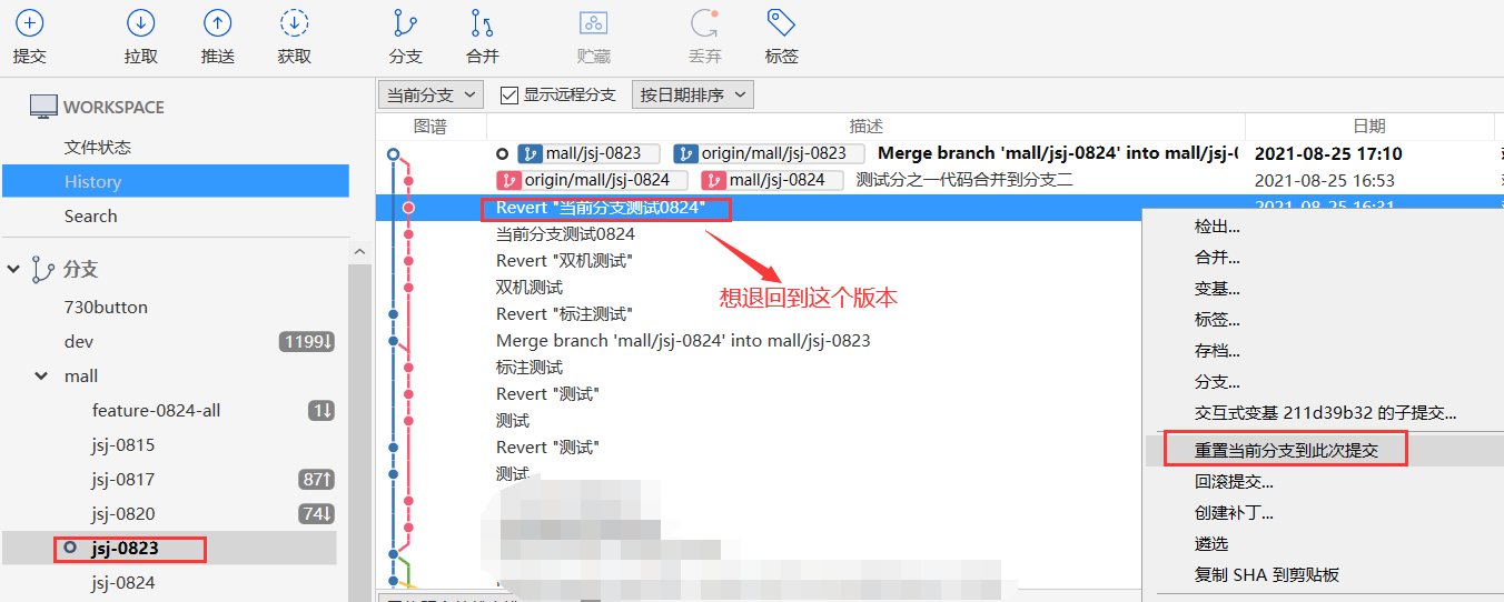 选择刚刚推送分支节点的前一个或者某个节点,右击-->“重置当前分支到此次提交"