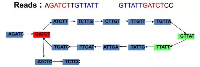 首先将reads打断成长度为K的核酸片段,即Kmer,在利用Kmer间的overlap关系构建DBG,再通过DBG得到基因组序列。