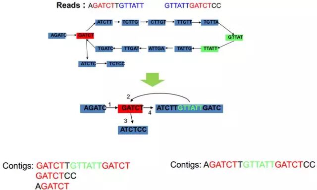 (1)通过Kmer之间K-1的overlap关系构建contig(重叠群),如图2: