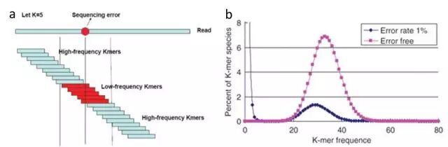 将reads逐bp打断成长度为K的连续核酸序列,如上图a所示,若这条reads中间由于测序错误有一个错误的碱基,那么在得到的Kmer中,也会有一些错误Kmer或者低频Kmer。