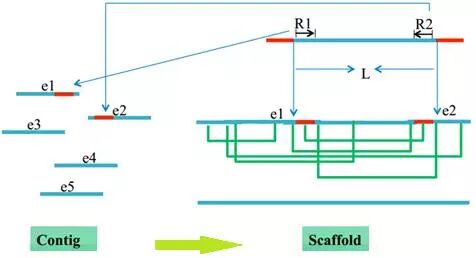 (2)利用pair-end信息,将无overlap关系的contigs搭建成scaffold(脚手架),如图3: