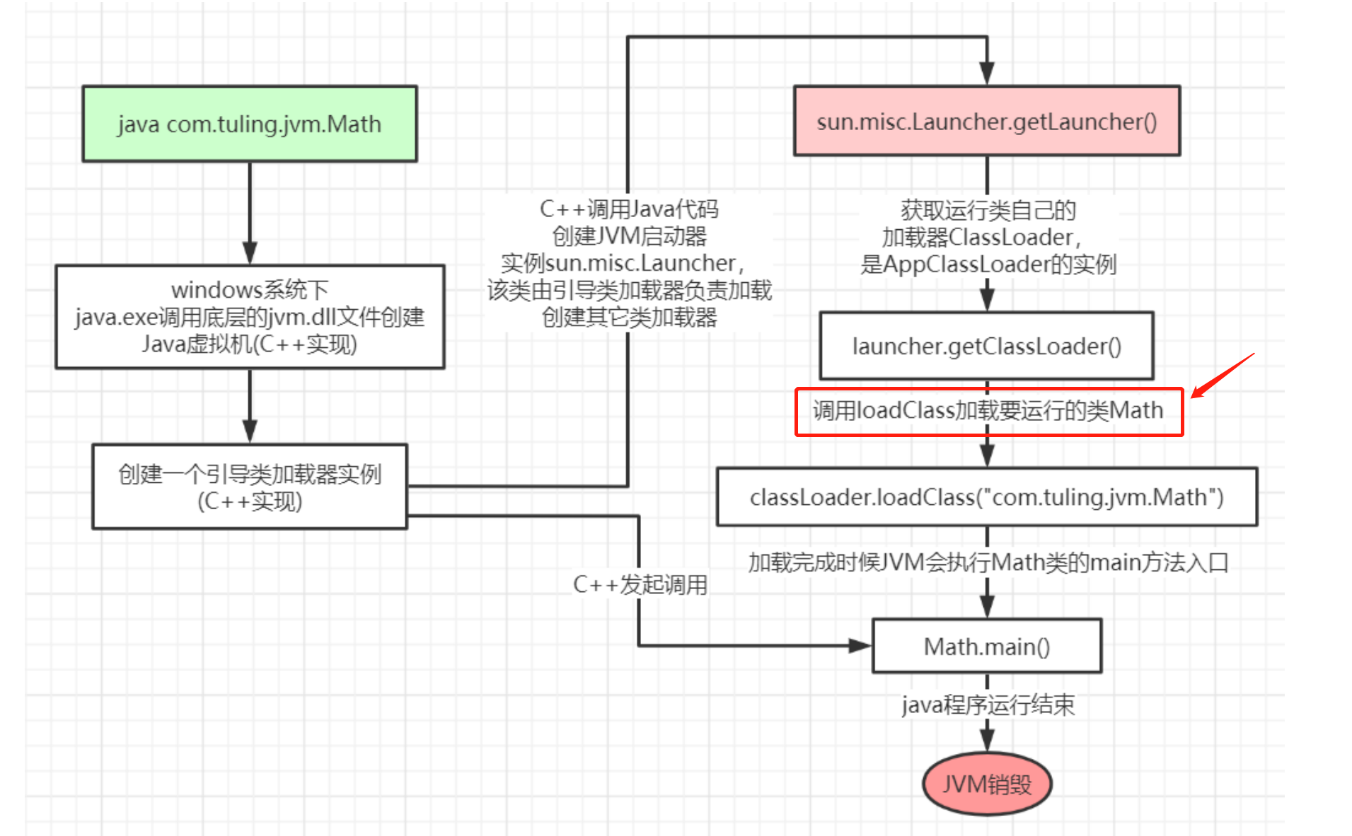 当运行程序中的main方法时,首先通过类加载器把主类加载到JVM: