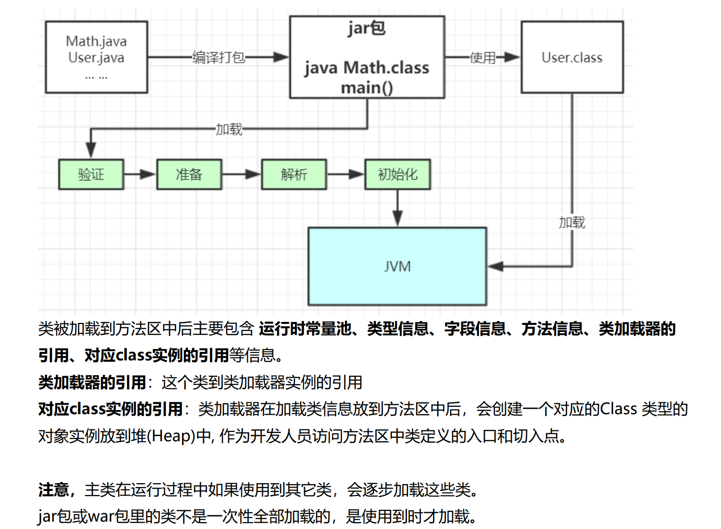 加载:在硬盘上查找并通过IO读入字节码文件,使用到类时才会加载,例如调用类的 main()方法,new对象等等,在加载阶段会在内存中生成一个代表这个类的 java.lang.Class对象,作为方法区这个类的各种数据的访问入口