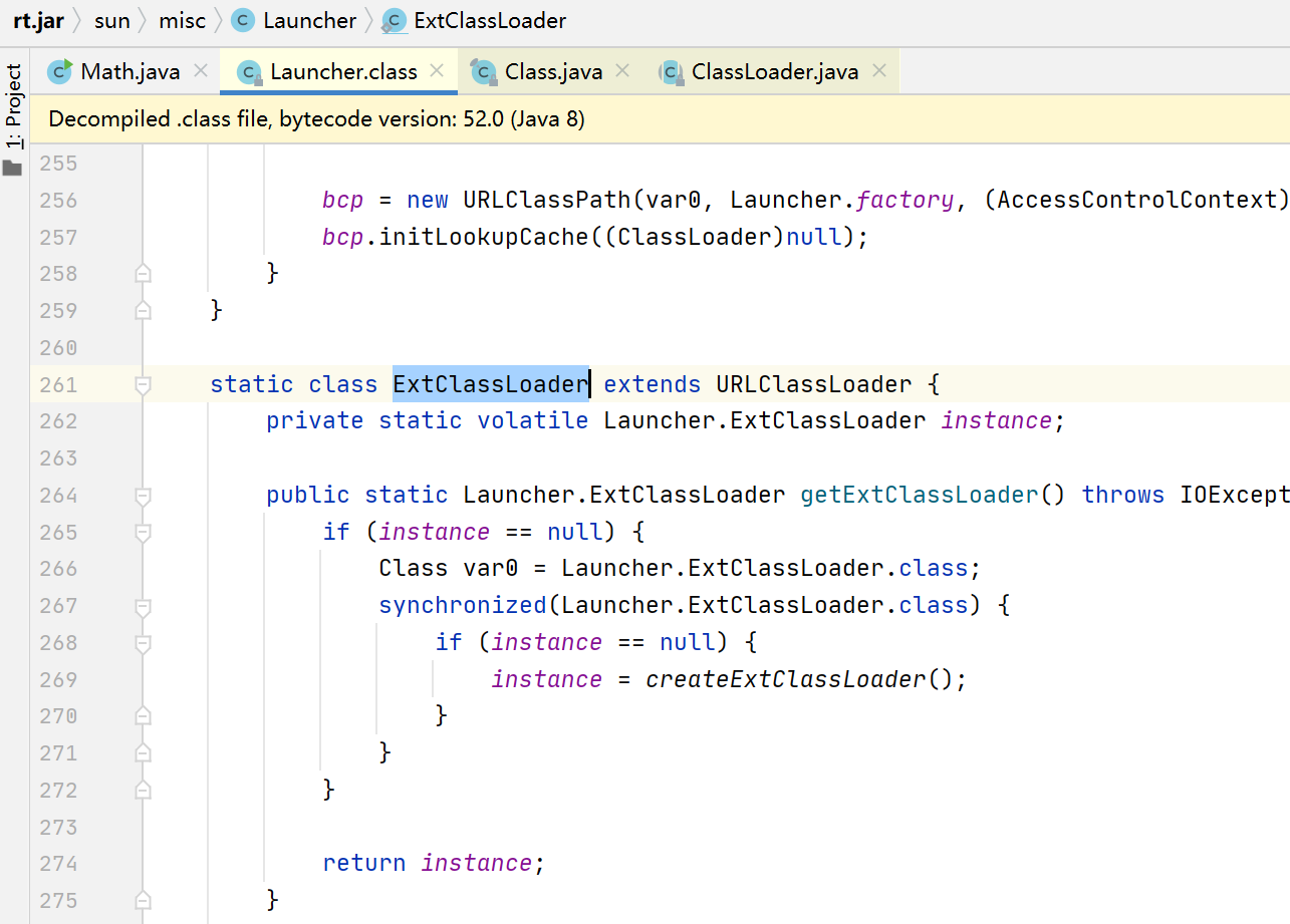 参见类运行加载全过程图可知其中会创建JVM启动器实例sun.misc.Launcher。 sun.misc.Launcher初始化使用了单例模式设计,保证一个JVM虚拟机内只有一个 sun.misc.Launcher实例。 在Launcher构造方法内部,其创建了两个类加载器,分别是 sun.misc.Launcher.ExtClassLoader(扩展类加载器)和sun.misc.Launcher.AppClassLoader(应 用类加载器)。 JVM默认使用Launcher的getClassLoader()方法返回的类加载器AppClassLoader的实例加载我们 的应用程序。