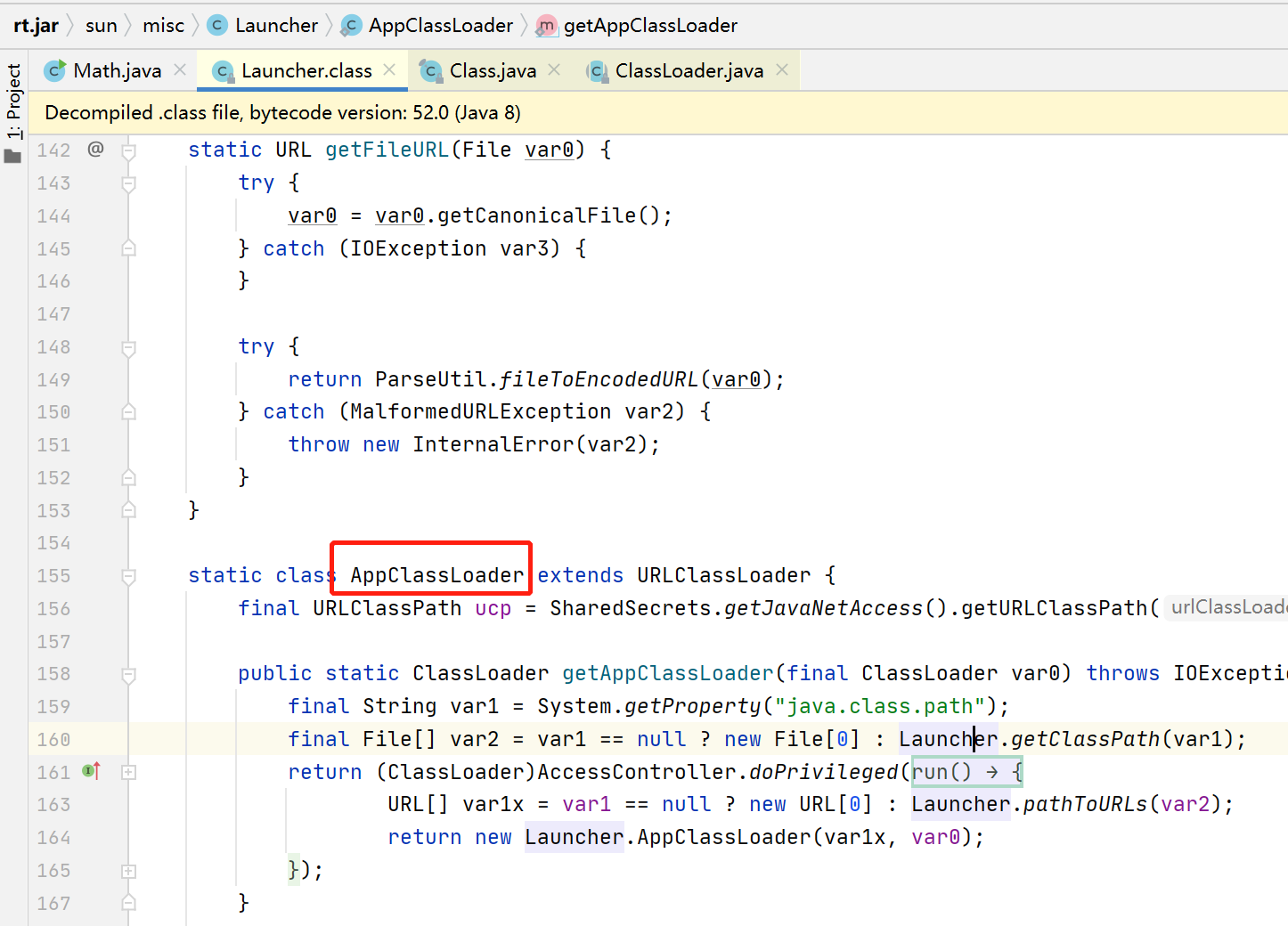 如果所有父加载器在自己的加载类路径下都找不到目标类,则在自己的类加载路径中查找并载入目标类。 比如我们的Math类,最先会找应用程序类加载器加载,应用程序类加载器会先委托扩展类加载 器加载,扩展类加载器再委托引导类加载器,顶层引导类加载器在自己的类加载路径里找了半天 没找到Math类,则向下退回加载Math类的请求,扩展类加载器收到回复就自己加载,在自己的 类加载路径里找了半天也没找到Math类,又向下退回Math类的加载请求给应用程序类加载器, 应用程序类加载器于是在自己的类加载路径里找Math类,结果找到了就自己加载了。。