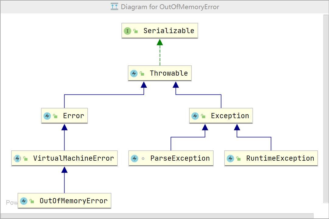 Ⅰ、Error,错误,通常是指程序无法处理的异常,系统会处理,一般指的是硬件异常,如:OutOfMemoryError、StackOverflowError等
