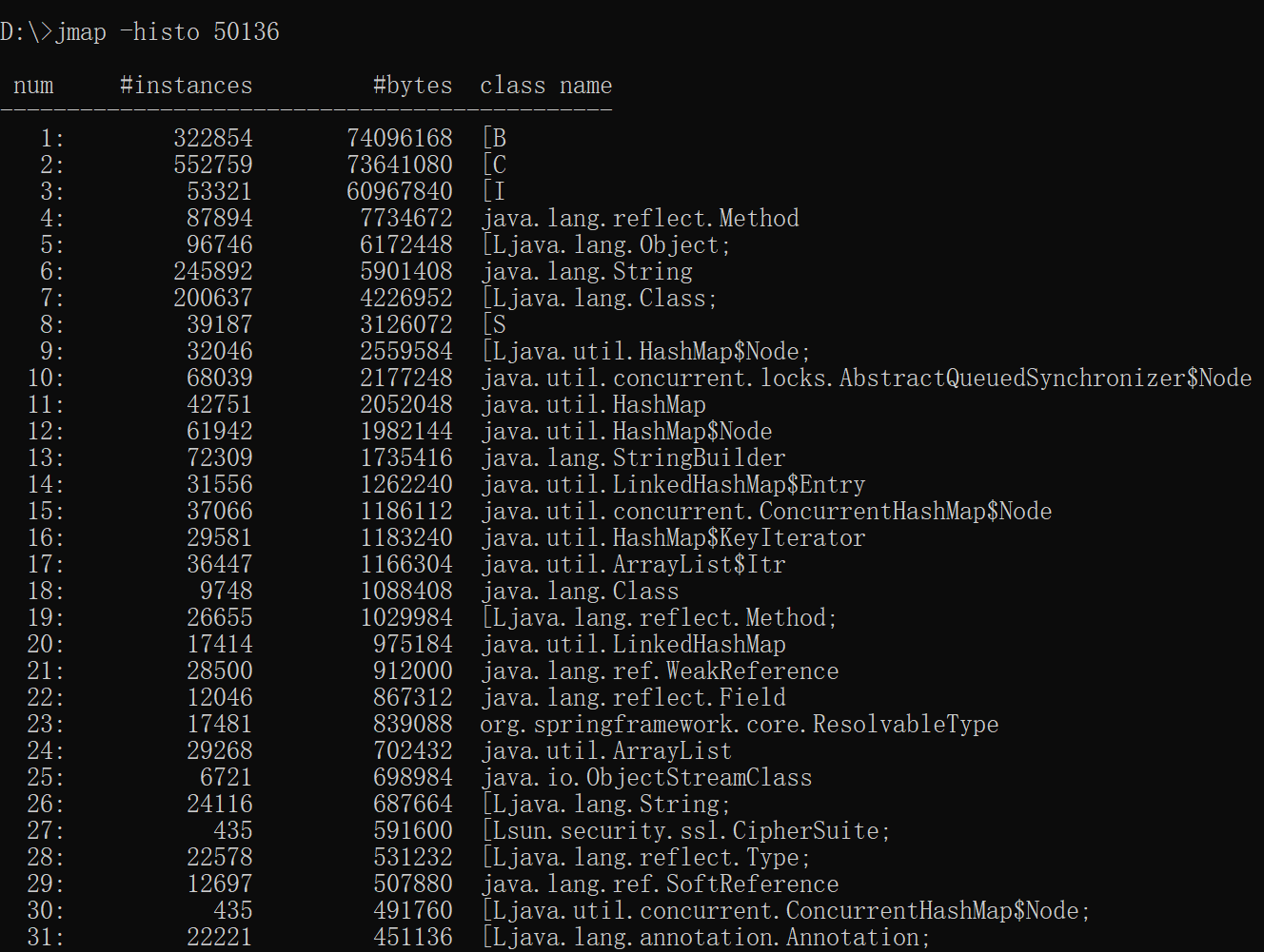 // 输出到指定文件 >JMap -histo (端口号) >./log.txt
