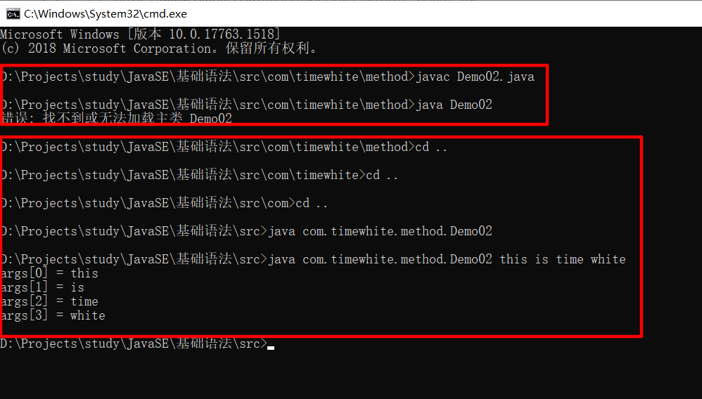 package com.timewhite.method; public class Demo02 { public static void main(String[] args) { for (int i = 0; i < args.length; i++) { System.out.println("args[" + i + "] = " + args[i]); } } }![]()