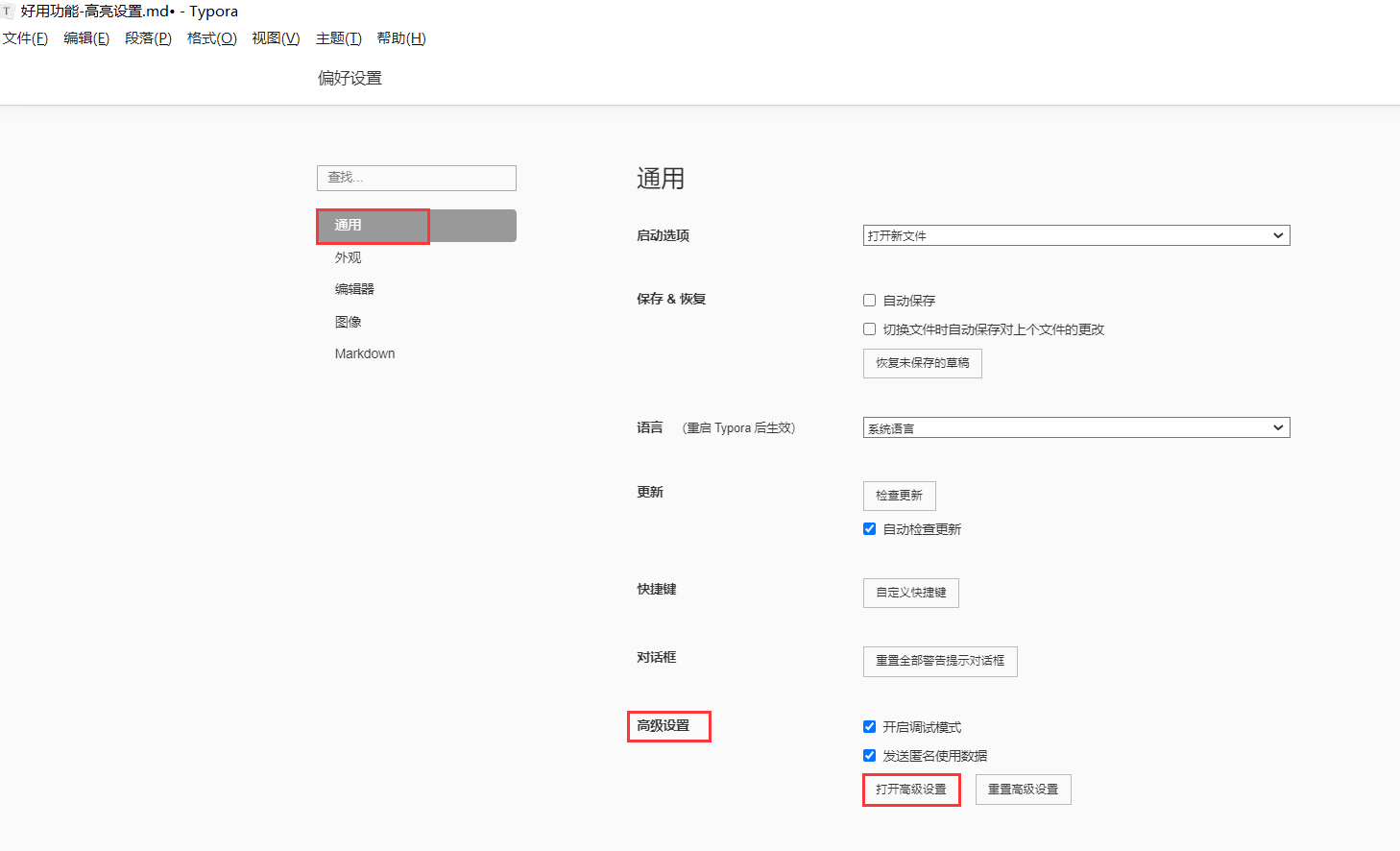 文件 -> 偏好设置 -> 通用 -> 高级设置 -> 打开高级设置