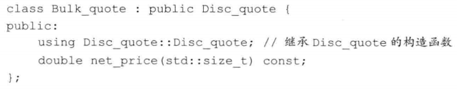举个例子,我们可以重新定义Bulk_quote类(参见15.4节,第541页),令其继承Disc_quote类的构造函数: