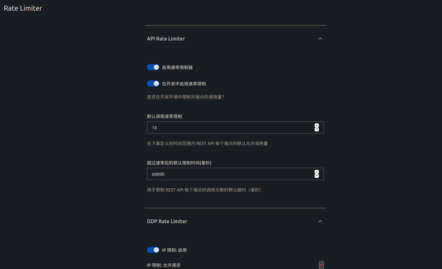 在管理页面有个 Rate Limiter 的配置项,可以限制请求频率,可是频率无论调到多小都不生效。