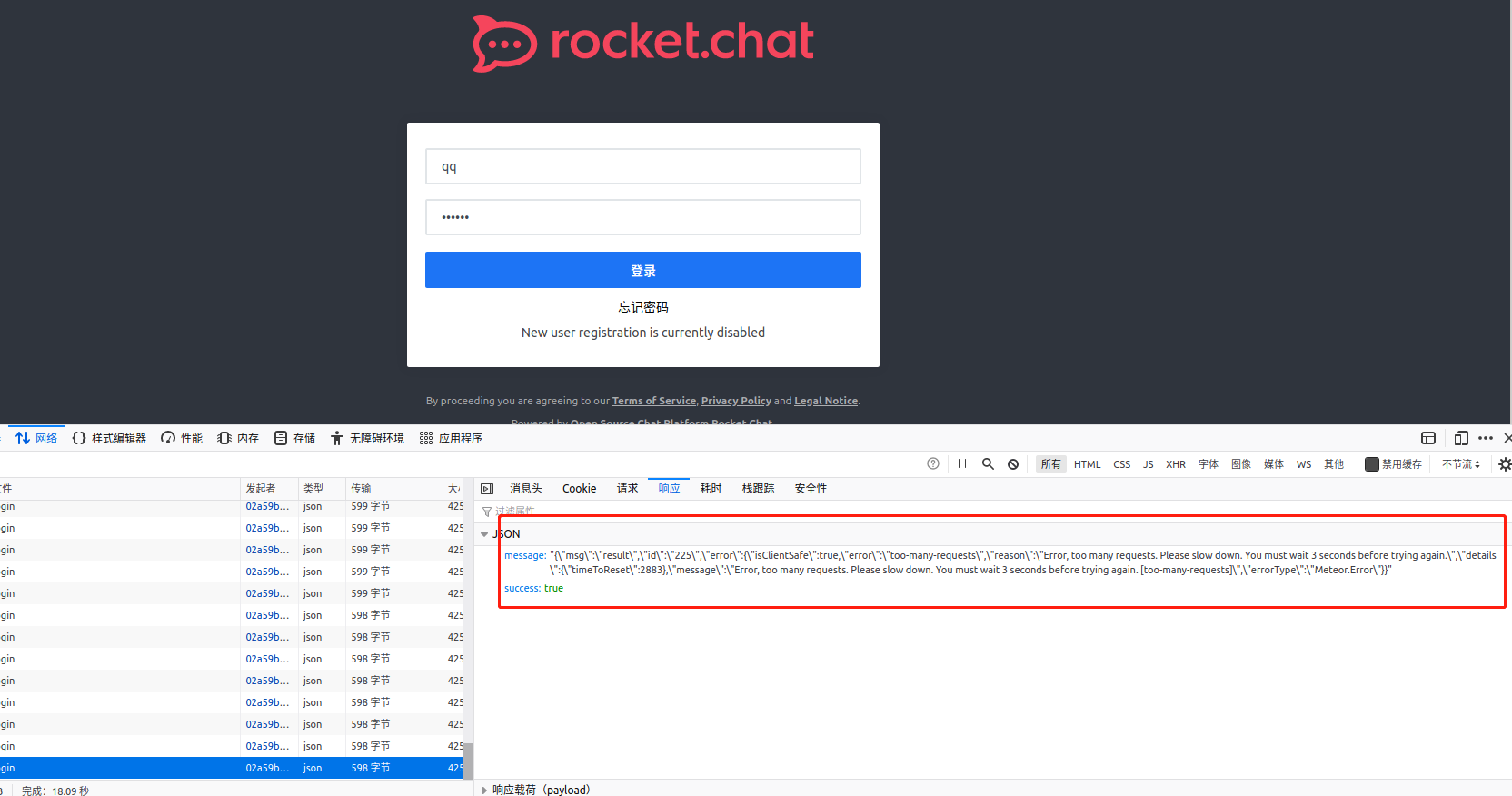 然后登陆rocketchat, 报错 Error, too many requests. Please slow down. You must wait 60 seconds before trying again