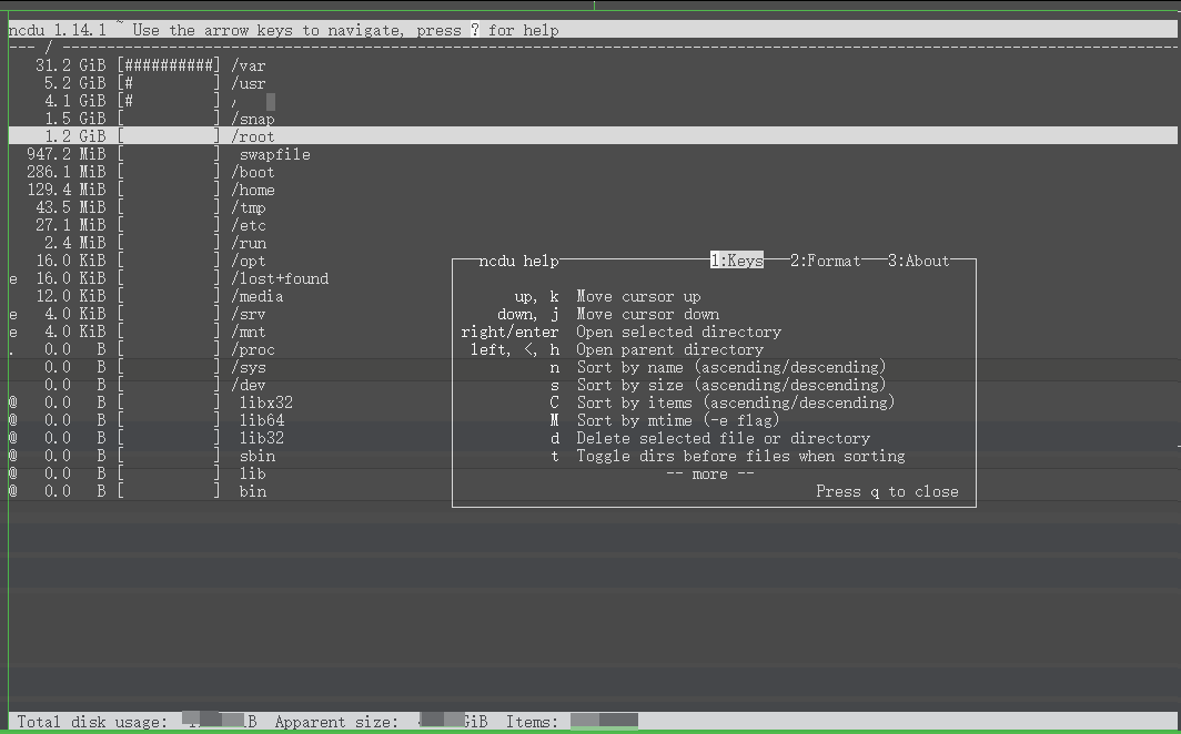 这将打开一个交互式界面,显示当前目录的磁盘使用情况。你可以使用箭头键浏览目录,按d键删除选中的文件或目录。