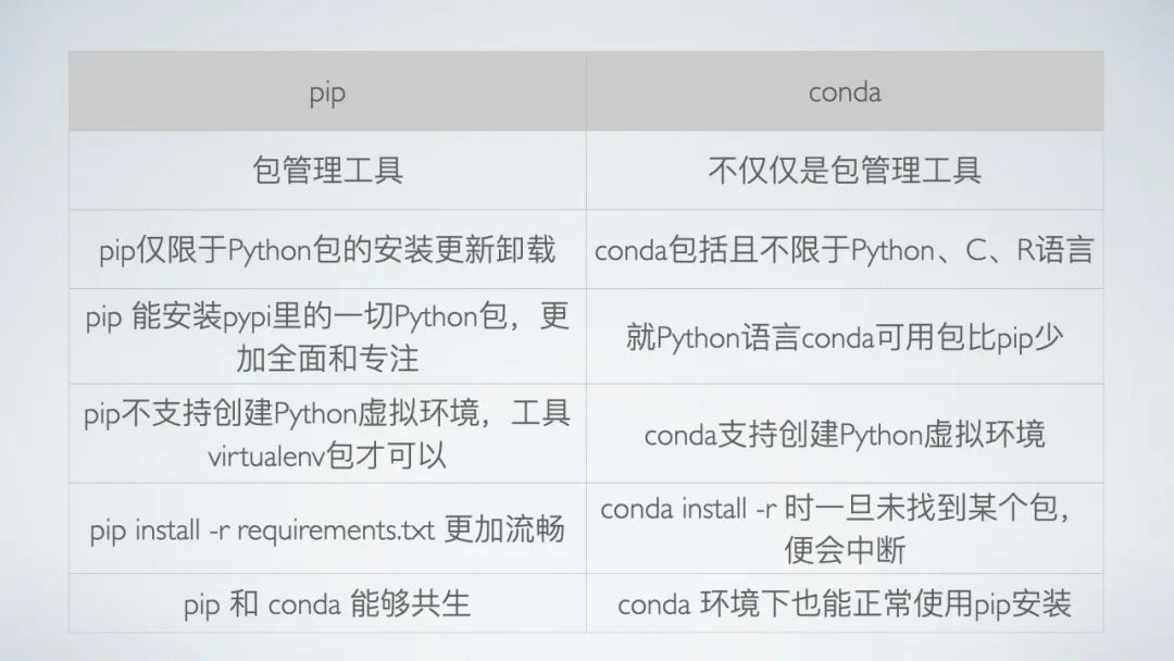 pip几乎就是个安装包的软件,conda是个环境管理的工具。conda自己可以用来创建环境,pip不能,需要依赖virtualenv之类的。意味着你能用conda安装python解释器,pip不行。这一点我觉得是conda很有优势的地方,用conda env可以很轻松地管理很多个版本的python,pip不行。