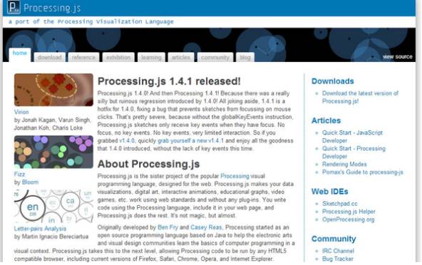 Processing的姐妹站点,Processing.js这个工具可以处理复杂的数据视觉化、图形、图表或是其他视觉效果,并是网页可用的形式,并不需要任何扩展程序或插件。这就意味着你可以运用标准Processing语言写代码并且插入到你的网站,而且Processing.js并不需要额外的编码需求来实现其功能。