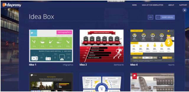 专为研究分析师设计,Dapresy允许用户运用简易使用的拖拉界面建立为他们的幻灯片和仪表盘建立信息图表。Dapresy是一个综合性平台能够处理整个报道过程,从数据分析到视觉上具有吸引力的展示工具和仪表板。