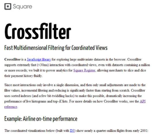 14CrossfilterCrossfilter使我们能够在浏览器里探索大量多元数据集,也是JavaScript库,能够处理超过一百万记录的数据集。Crossfilter使用语义版本控制并且易于使用值、目标和其他元素和命令来自定义的创建数据可视化。实际上,它使Square Register的商家有权利操纵销售和购买数据。