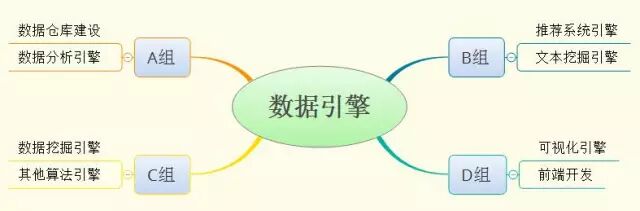 在A公司的数据引擎团队中,主要人员分成A、B、C、D四个大组。这四个大组的分工非常明确,如下图所示: