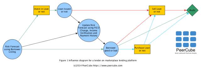 影响图网可以确定决策的重要方面,有哪些数据与决策相关,以及在哪些方面有关。图网包括三种节点:决策(长方形节点),不确定事件(圆形节点),以及结果(菱形节点)。各节点由箭头相互连接。图1从市场中贷款人的角度进行绘制。