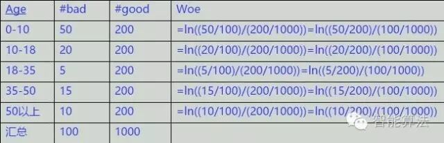 表中以age年龄为某个自变量,由于年龄是连续型自变量,需要对其进行离散化处理,假设离散化分为5组,#bad和#good表示在这五组中违约用户和正常用户的数量分布,最后一列是woe值的计算,通过后面变化之后的公式可以看出,woe反映的是在自变量每个分组下违约用户对正常用户占比和总体中违约用户对正常用户占比之间的差异;从而可以直观的认为woe蕴含了自变量取值对于目标变量(违约概率)的影响。再加上woe计算形式与logistic回归中目标变量的logistic转换(logist_p=ln(p/1-p))如此相似,因而可以将自变量woe值替代原先的自变量值;