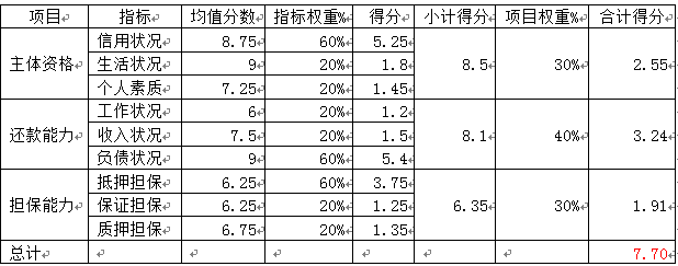 客户的信用等级简易评估办法,就是依据一系列实测指标,经评估打分综合划分出客户的信用等级。 为计算方便采用满分为10分制,根据对征信资料的审查核实,对每一项指标打分后综合计算平均值,最后再加权计算综合得分。