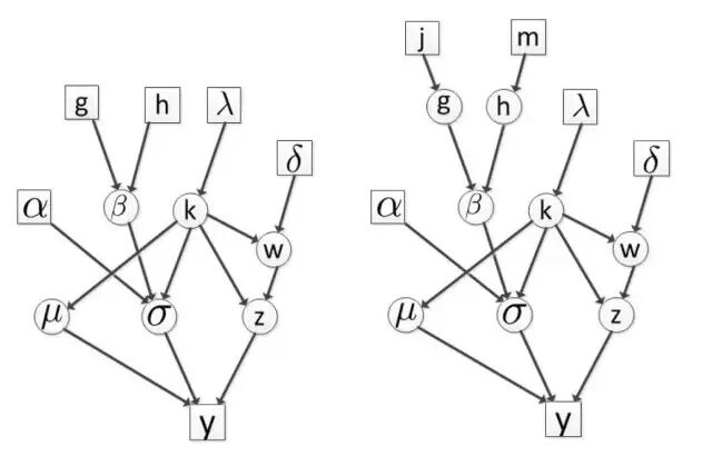 第二个例子,我们来看多级贝叶斯模型。在进行MCMC抽样后验估计时,最上层的超参数总是需要先人为给定的,自然地,MCMC算法收敛性能是依赖这些给定的超参数的,如果我们对这些参数的选取没有好的经验,那么一个可能做法我们再加一层,层数越多对超参数选取的依赖性会减弱。