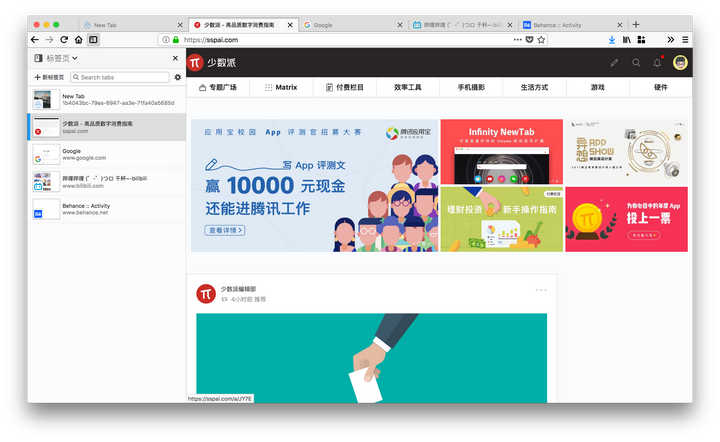 - Tile Tabs ( 72,263 个用户): 和基于窗口分割平铺的 Fox Splitter 不同,Tile Tabs 提供的是基于标签页的分割平铺。它预置多种平铺选项,也可以自定义平铺方式,使用快捷键 F12 即可启用。快捷键 F9 启动滚动同步。类似的插件还有: