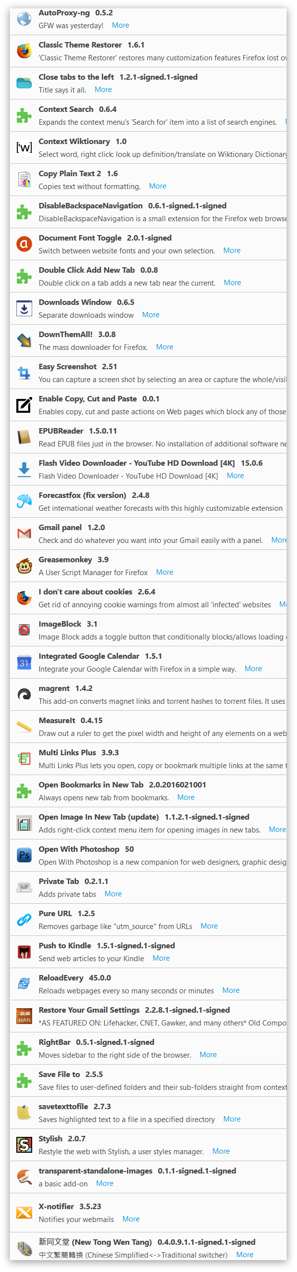 首先这篇答案是用All-in-One Sidebar打开侧栏照打的...以下addons是经过自己精挑细选最终不得不用的,按字母排序:
