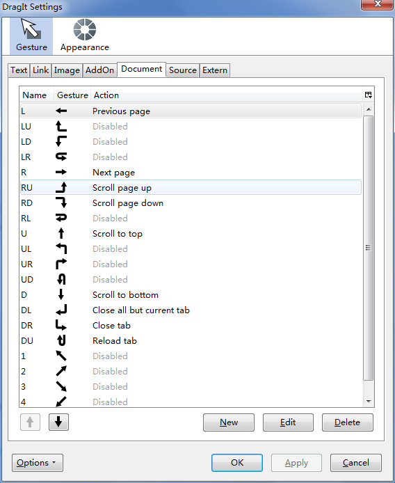 如何设置 打开“工具>附加组件>Quick Gestures”页面。 点击“Open”按钮,找出所有命令和默认的映射。 默认的映射由特定的大写字母(UDLR)组成,其中“U D L R”分别代表“向上向下向左向右”滑动。可以轻松实现页面的前进后退等操作。