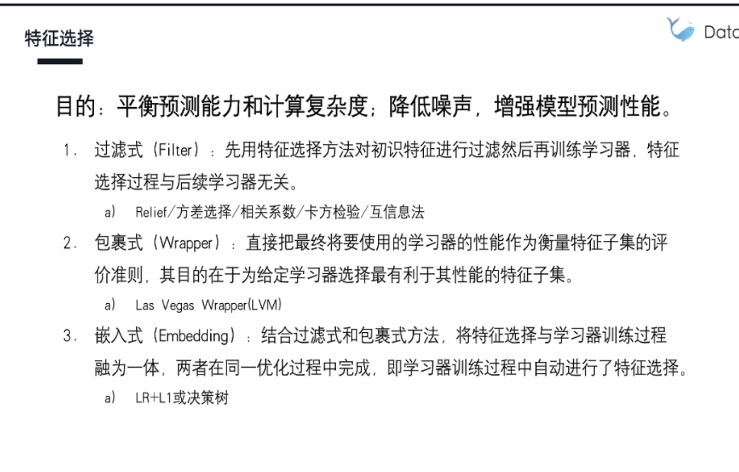 - 嵌入式(embedding):结合过滤式和包裹式,学习器训练过程中自动进行了特征选择,常见的有 lasso 回归;