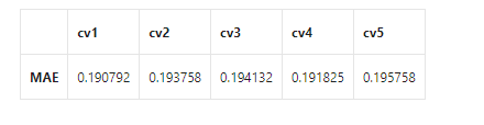 scores = cross_val_score(model, X=train_X, y=train_y_ln, verbose=1, cv = 5, scoring=make_scorer(mean_absolute_error))