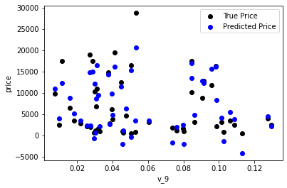 绘制特征v_9的值与标签的散点图,图片发现模型的预测结果(蓝色点)与真实标签(黑色点)的分布差异较大,且部分预测值出现了小于0的情况,说明我们的模型存在一些问题