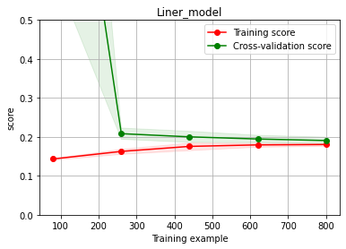 plot_learning_curve(LinearRegression(), 'Liner_model', train_X[:1000], train_y_ln[:1000], ylim=(0.0, 0.5), cv=5, n_jobs=1)