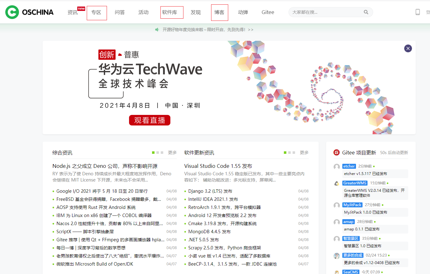 有开源软件、程序、博客,各个专业领域的推荐。也有飞桨专区、鸿蒙专区等