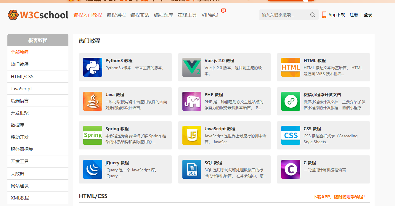 各种文档,各种基础教程,教你学会语言、开发、基础,你可以找到你所需要的所有的网站建设教程,是免费的,从基础的 HTML 到 CSS,乃至进阶的XML、SQL、JS、PHP 。非常非常推荐。