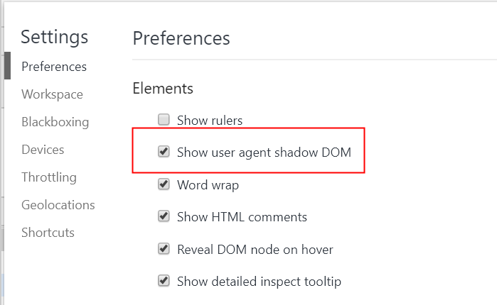 实现:Settings → Preferences→ Elements → Show user agent shadow DOM