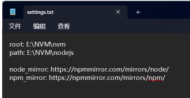 进入nvm >> settings.txt 文件,在文件的末尾加上下面两行内容,记得保存: