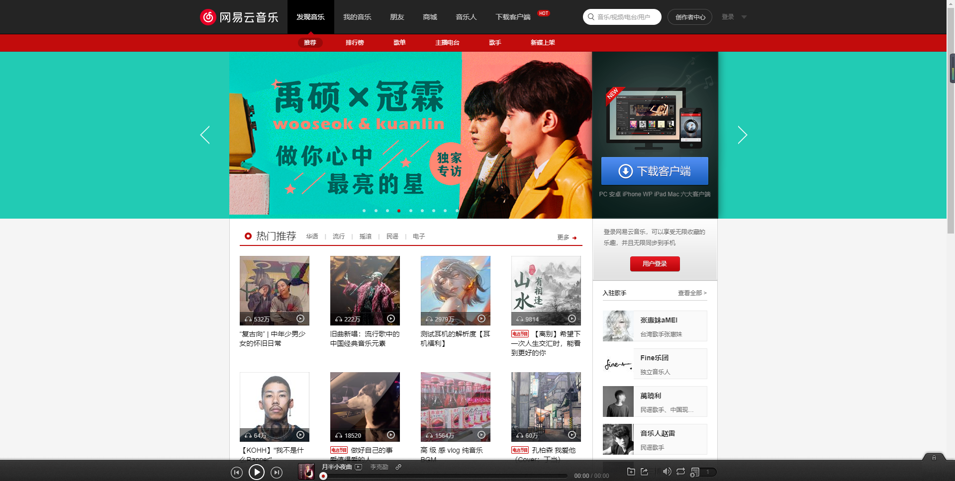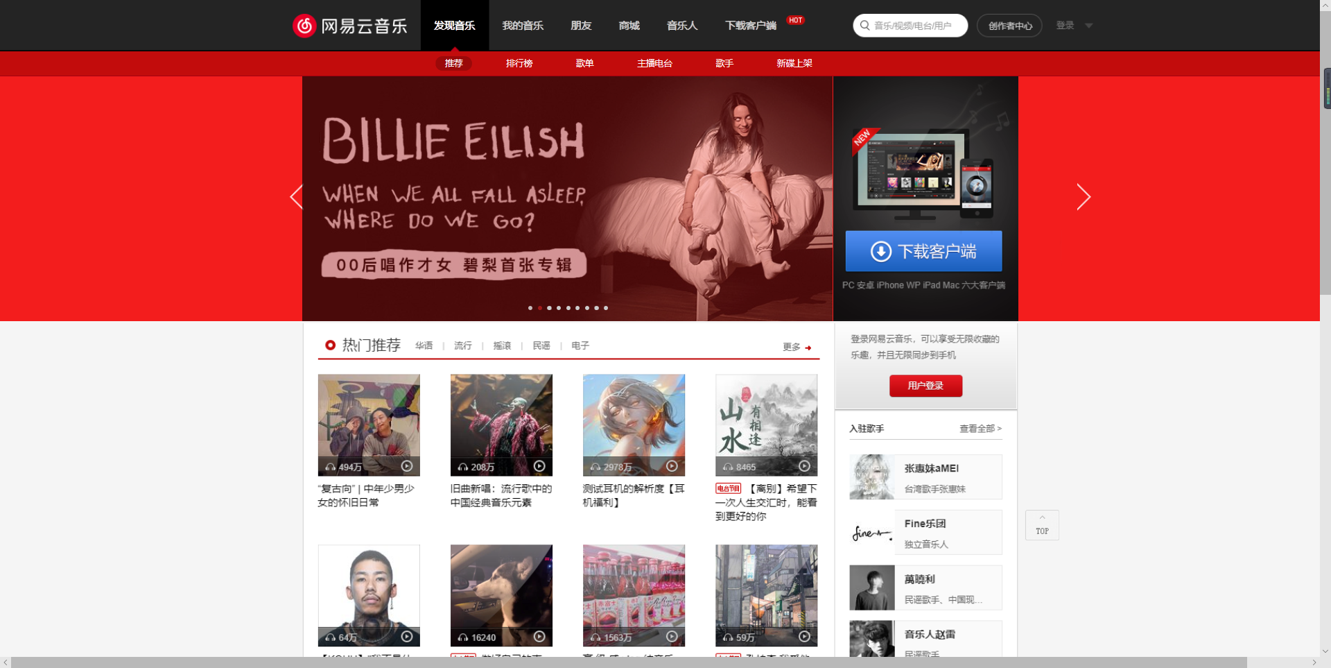 <!DOCTYPE html> <html> <head> <title>网易云音乐</title> <meta charset="utf-8"> <style type="text/css"> @import url("index.css"); </style> </head> <body> <div class="header"> <div class="first_floor"> <div class="wrap"> <h1 class="logo"><a href="https://music.163.com/#" hidefocus="true" style="display:block; position:absolute;left:401.5px;top:0;width:176px;height:70px"></a></h1> <ul class="block"> <li><a hidefocus="true" href="https://music.163.com/#" class="active1">发现音乐</a></li> <li><a hidefocus="true" href="https://music.163.com/#/my/">我的音乐</a></li> <li><a hidefocus="true" href="https://music.163.com/#/friend">朋友</a></li> <li><a hidefocus="true" href="https://music.163.com/store/product" target="_blank">商城</a></li> <li><a hidefocus="true" href="https://music.163.com/nmusician/web/index#/" target="_blank">音乐人</a></li> <li><a hidefocus="true" href="https://music.163.com/#/download">下载客户端</a></li> </ul> </div> </div> <div class="second_floor"> <div class="wrap"> <ul class="nav"> <li><a hidefocus="true" href="https://music.163.com/#/discover" class="active2">推荐</a></li> <li><a hidefocus="true" href="https://music.163.com/#/discover/toplist">排行榜</a></li> <li><a hidefocus="true" href="https://music.163.com/#/discover/playlist">歌单</a></li> <li><a hidefocus="true" href="https://music.163.com/#/discover/djradio">主播电台</a></li> <li><a hidefocus="true" href="https://music.163.com/#/discover/artist">歌手</a></li> <li><a hidefocus="true" href="https://music.163.com/#/discover/album">新碟上架</a></li> </ul> </div> </div> </div> <div class="chest"> <div class="wrap"> <div class="slideshow-container"> <div class="mySlides fade"> <div align="center"><a hidefocus="true" href="https://music.163.com/#/album?id=78248182"><img src="http://p1.music.126.net/v7e_QnwshJhqSFmtU4MXfA==/109951163960448474.jpg" width="728px" height="336px"></a></div> </div> <div class="mySlides fade"> <div align="center"><a hidefocus="true" href="https://music.163.com/#/album?id=78243642"><img src="http://p1.music.126.net/8JuvNOMUOyxQavpPeAtetw==/109951163959129050.jpg" width="728px" height="336px"></a></div> </div> <div class="mySlides fade"> <div align="center"><a hidefocus="true" href="https://music.163.com/#/album?id=75889321"><img src="http://p1.music.126.net/ey824I7-Jr09_ywahBmbpA==/109951163964297773.jpg" width="728px" height="336px"></a></div> </div> <div class="mySlides fade"> <div align="center"><a hidefocus="true" href="https://music.163.com/#/mv?id=10859974"><img src="http://p1.music.126.net/a4kykRjGNFXFUHzp1uKakw==/109951163964295354.jpg" width="728px" height="336px"></a></div> </div> <div class="mySlides fade"> <div align="center"><a hidefocus="true" href="https://music.163.com/#/topic?id=43332319"><img src="http://p1.music.126.net/mi-wOm4Mrgz_tfh950tMTA==/109951163963297115.jpg" width="728px" height="336px"></a></div> </div> <div class="mySlides fade"> <div align="center"><a hidefocus="true" href="https://music.163.com/#/album?id=78221460"><img src="http://p1.music.126.net/pB811E-57tElUG4JMU4hwA==/109951163964299626.jpg" width="728px" height="336px"></a></div> </div> <div class="mySlides fade"> <div align="center"><a hidefocus="true" href="https://music.163.com/#/song?id=1355228849"><img src="http://p1.music.126.net/PDNAd8mV7h2fN-2bt89Wpw==/109951163963293968.jpg" width="728px" height="336px"></a></div> </div> <div class="mySlides fade"> <div align="center"><a hidefocus="true" href="https://music.163.com/m/at/5c9db3bf7a561595a629c602" target="_blank"><img src="http://p1.music.126.net/ODgL183yqdRolEiBB1uO3g==/109951163963302349.jpg" width="728px" height="336px"></a></div> </div> <div class="mySlides fade"> <div align="center"><a hidefocus="true" href="https://music.163.com/m/at/5c9dd115bcb62e8de3c8b614" target="_blank"><img src="http://p1.music.126.net/PPjPPrDMq2GGSxtJdD7AxA==/109951163963314083.jpg" width="728px" height="336px"></a></div> </div> <a class="prev" onclick="plusSlides(-1)"></a> <a class="next" onclick="plusSlides(1)"></a> <div class="dots"> <span class="dot" onclick="currentSlide(1)"></span> <span class="dot" onclick="currentSlide(2)"></span> <span class="dot" onclick="currentSlide(3)"></span> <span class="dot" onclick="currentSlide(4)"></span> <span class="dot" onclick="currentSlide(5)"></span> <span class="dot" onclick="currentSlide(6)"></span> <span class="dot" onclick="currentSlide(7)"></span> <span class="dot" onclick="currentSlide(8)"></span> <span class="dot" onclick="currentSlide(9)"></span> </div> </div> <script> var slideIndex = 0; showSlides(); function showSlides() { var i; var slides = document.getElementsByClassName("mySlides"); var dotss = document.getElementsByClassName("dot"); for (i = 0; i < slides.length; i++) { slides[i].style.display = "none"; } slideIndex++; if (slideIndex > slides.length) { slideIndex = 1 } for (i = 0; i < dotss.length; i++) { dotss[i].className = dotss[i].className.replace(" active", ""); } slides[slideIndex-1].style.display = "block"; dotss[slideIndex-1].className += " active"; setTimeout(showSlides, 4000); } </script> <div class="download"> <a id="side-download" href="https://music.163.com/#/download" class="btn" hidefocus="true" style="display:block; position:absolute;left:18px;top:214px;width:214px;height:57px"></a> </div> </div> </div> <div class="leg"> <div class="wrap"> <center><img src="images\leg.png"></center> <a href="https://music.163.com/#"style="display:block; position:absolute;left:460.5px;top:441px;width:982px;height:1575px"></a> </div> </div> <div class="foot"> <img src="images\foot.png" width=1903px> </div> <a title="回到顶部" class="m-back" href="#" id="g_backtop" hidefocus="true" style="">回到顶部</a> </body> </html>