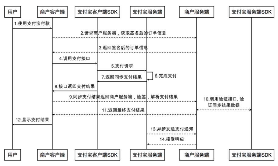 第5步:支付请求:支付宝客户端SDK将会按照商户客户端提供的请求参数发送支付请求。