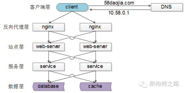 常见互联网分布式架构如上,分为客户端层、反向代理nginx层、站点层、服务层、数据层。可以看到,每一个下游都有多个上游调用,只需要做到,每一个上游都均匀访问每一个下游,就能实现“将请求/数据【均匀】分摊到多个操作单元上执行”。