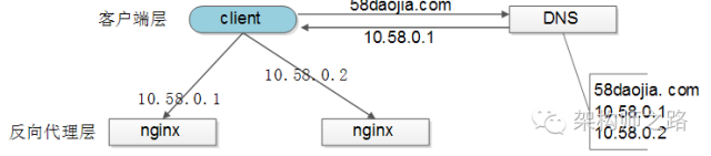 (1)【客户端层】到【反向代理层】的负载均衡,是通过“DNS轮询”实现的