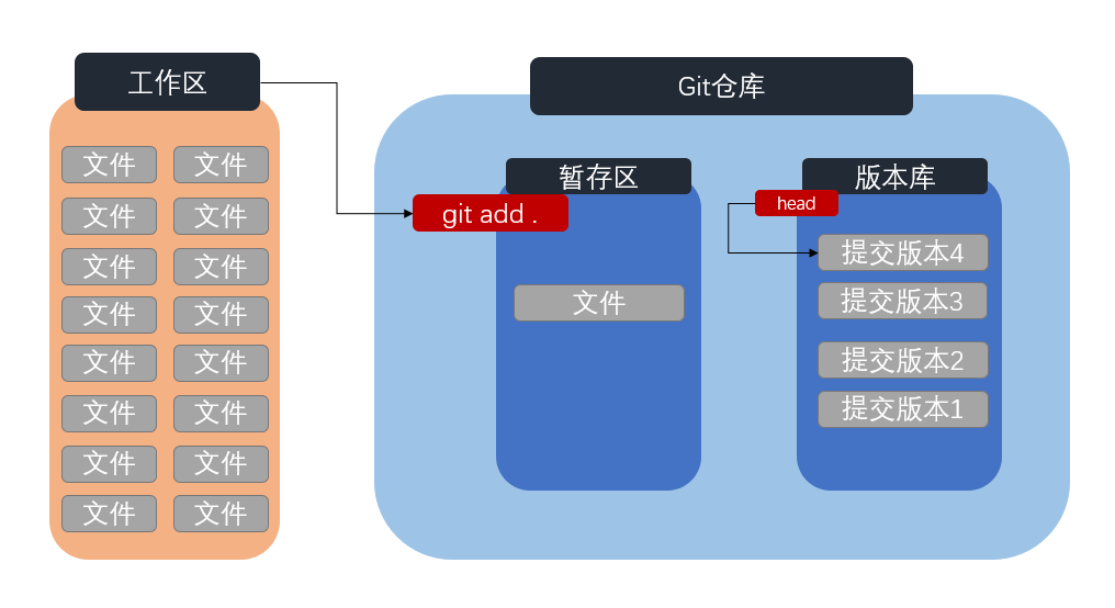 用户在工作区中编写的代码,都不会影响到git的版本库,如果说要想将工作区中的代码发布到版本库中,就需要先将工作区的代码提交到暂存库中,使用git add . 命令,然后再使用git commit -a -m "注释" 提交到版本库中。