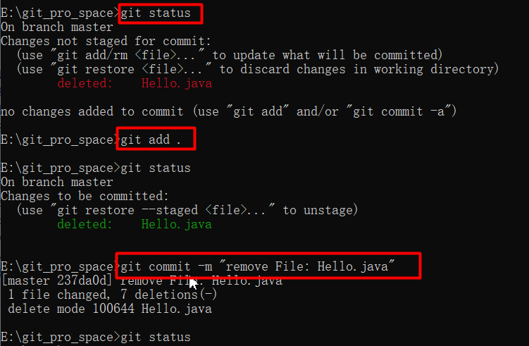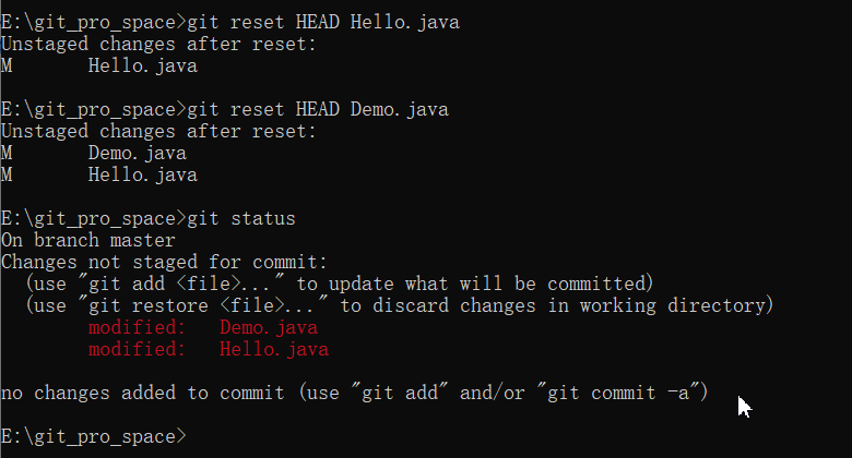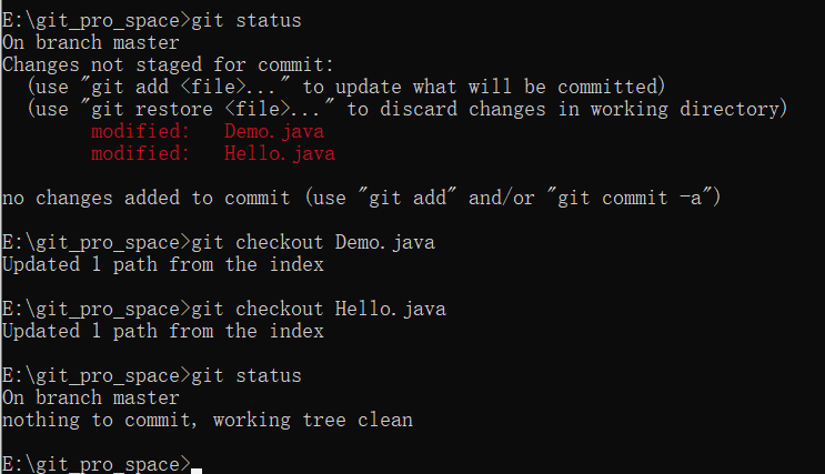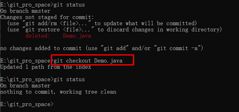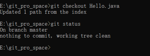 撤销回来之后查看状态,发现此时已经退回到工作区中了,在通过git checkout 文件名称 命令进行撤回操作