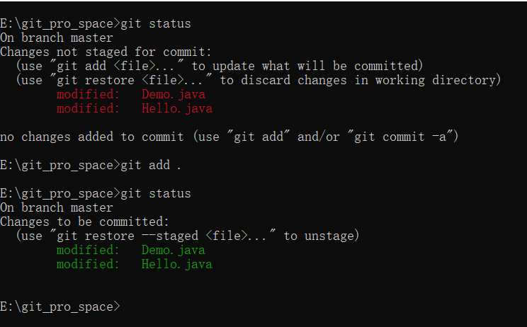 此时修改了两个文件,并且已经使用git add . 增加到了暂存区中,