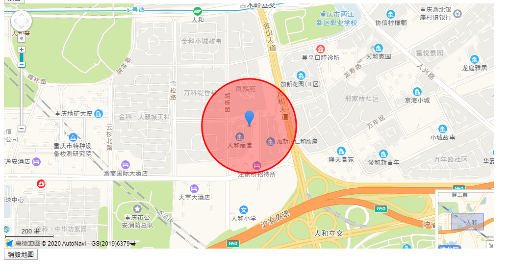 var map; //initMap为script.src 中的callback名称 window.initAMap = function(){ //container为盒子id 盒子需要定义宽高 map = new AMap.Map('container', { center: [106.524497,29.618969], zoom: 16, }); var toolbar = new AMap.ToolBar(); // 实例鹰眼 const overView = new AMap.OverView({ visible: true, }); overView.open(); // 实例比例尺 const scale = new AMap.Scale({ visible: true, }); // 设置中心点 const circle = new AMap.Circle( { center: new AMap.LngLat(106.524497,29.618969), // 圆心位置 radius: 200, //半径 strokeColor: 'red', //线颜色 strokeOpacity: 1, //线透明度 strokeWeight: 3, //线粗细度 fillColor: 'red', //填充颜色 fillOpacity: 0.35, //填充透明度 } ); // 标记点 var marker = new AMap.Marker({ position: new AMap.LngLat(106.524497,29.618969), // 经纬度对象,也可以是经纬度构成的一维数组[106.524497,29.618969] title: '人和' }); // 将创建的点标记添加到已有的地图实例: map.add(marker); // 添加填充区域 map.add(circle); //添加工具 map.addControl(overView); map.addControl(toolbar); map.addControl(scale); map.on('complete',finish(AMap));//地图加载完毕 } function finish(){ console.log('地图加载完成') } //地图销毁 function destroyMap () { map && map.destroy(); } document.getElementById('destoryMap').onclick = function(){ destroyMap() }