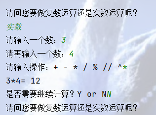 (1)构思程序,首先定义函数,再运用循环语句涵盖多种运算,输出作者水印,然后再用循环语句引入复数运算,运用之前定义的函数进行运算,并输出结果,再利用flag这个变量来决定运算的终止与否。
