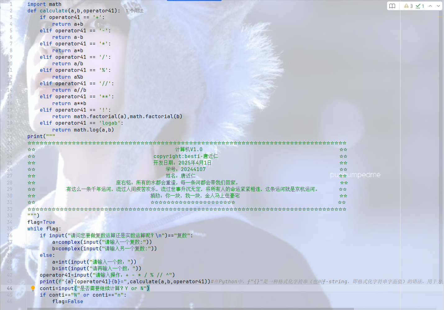 这次实验让我对编程有了更深刻的认识。最初设计程序时,总以为只要实现功能就行,却忽略了变量类型匹配、模块导入这些细节。比如复数运算时,直接使用operator模块导致命名冲突,后来改成operator41才解决。这让我明白,代码规范和命名习惯真的很重要。