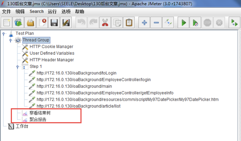 1.将badboy录制的脚本,导入jmeter,添加查看结果树、聚合报告;