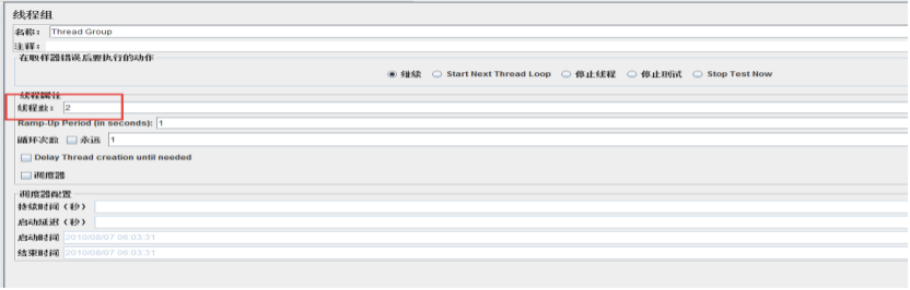 3.添加数量:我们并发10个用户,切记要修改线程数,因为线程数量不够会导致集合点,永远集合不到足够的用户数量,进行并发。