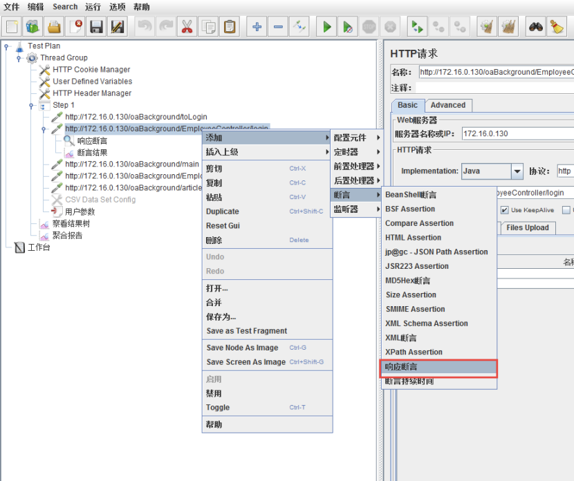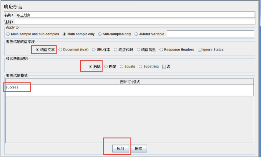 3.配置响应断言:响应文本中->包括->success;可以这样理解,然后运行吧.